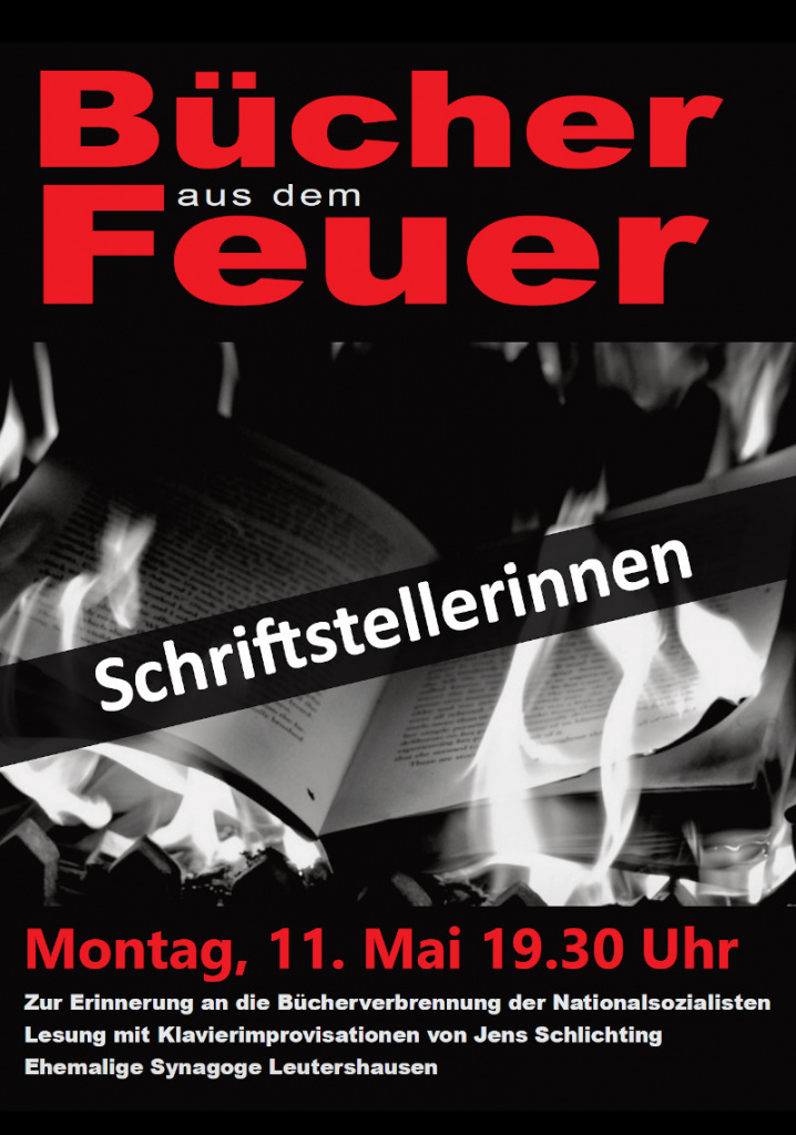 Acht Einrichtungen in Hirschberg erinnern gemeinsam an die Bücherverbrennung im Mai 1933, als die Nationalsozialisten unliebsame Werke öffentlich verbrannten und Berufsverbote verhängten. Während in den vergangenen Jahren bei dieser Gedenkreihe jeweils unterschiedliche Berufsgruppen im Fokus standen, widmet sie sich in diesem Jahr drei Schriftstellerinnen. Ihre Biografien und Werke werden in Lesungen vorgestellt und vom Pianisten Jens Schlichting musikalisch begleitet.